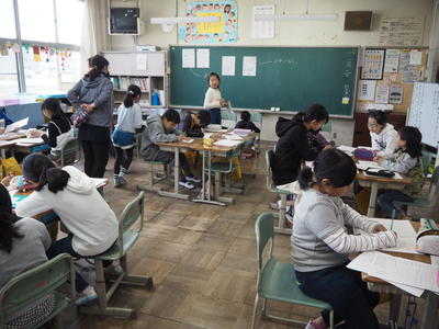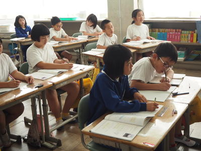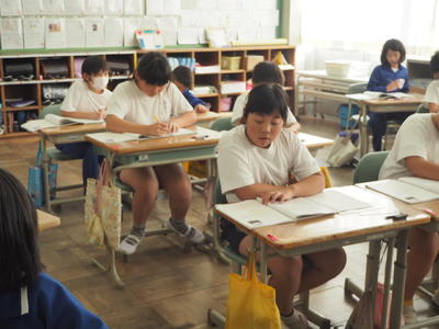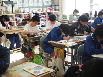 6年、外国語活動。映像をみて、その後、そのことをノートにまとめていました。