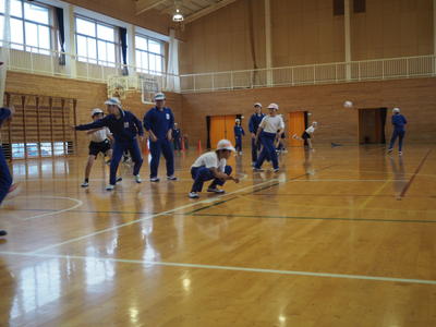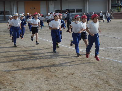 3年、体育。先ずは準備体操の後、持久走記録会の練習のため、校庭でならし走をしました。