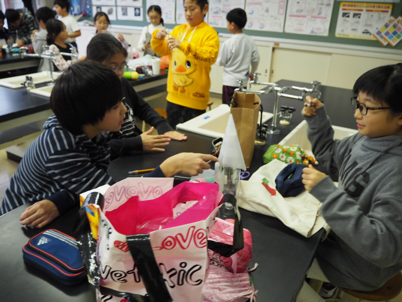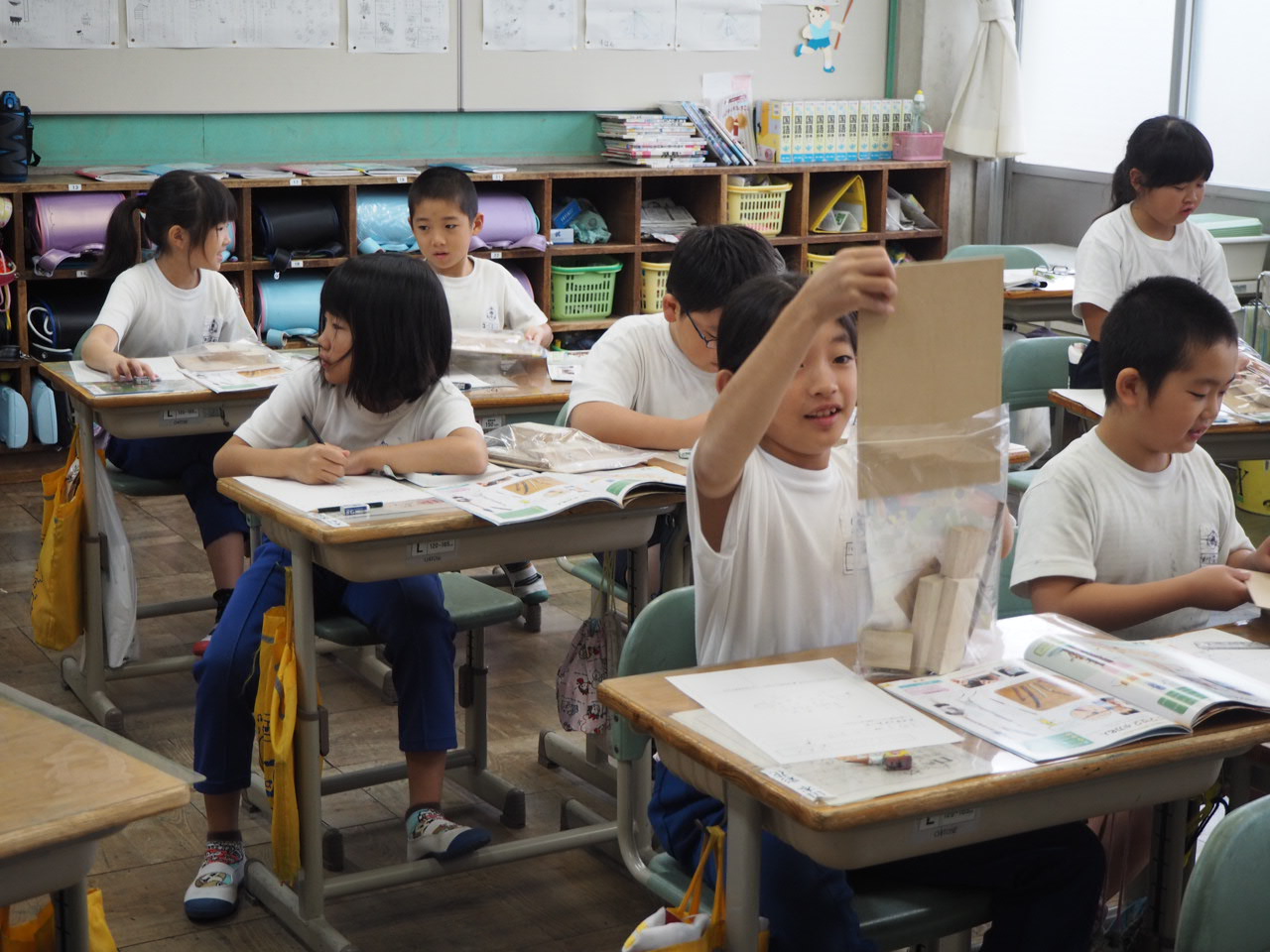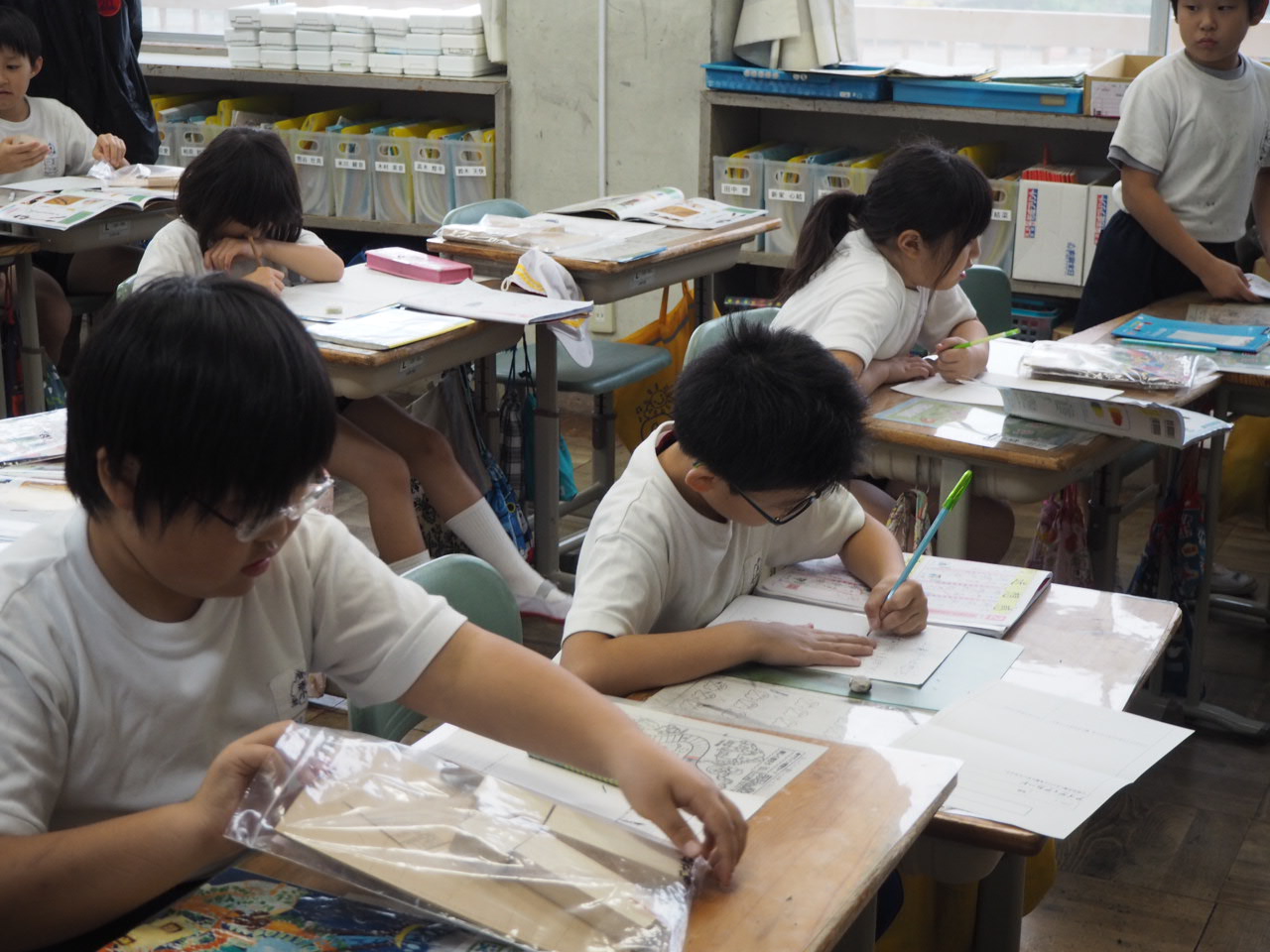 3年、図工「ドンドン トントン くぎ打ち名人」。先ずは、材料を見ながら何を作っていくか計画を立てています。