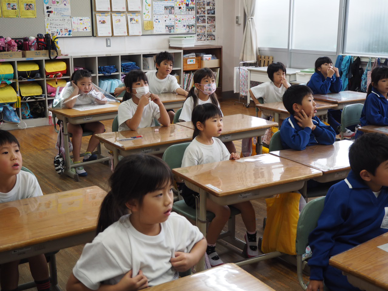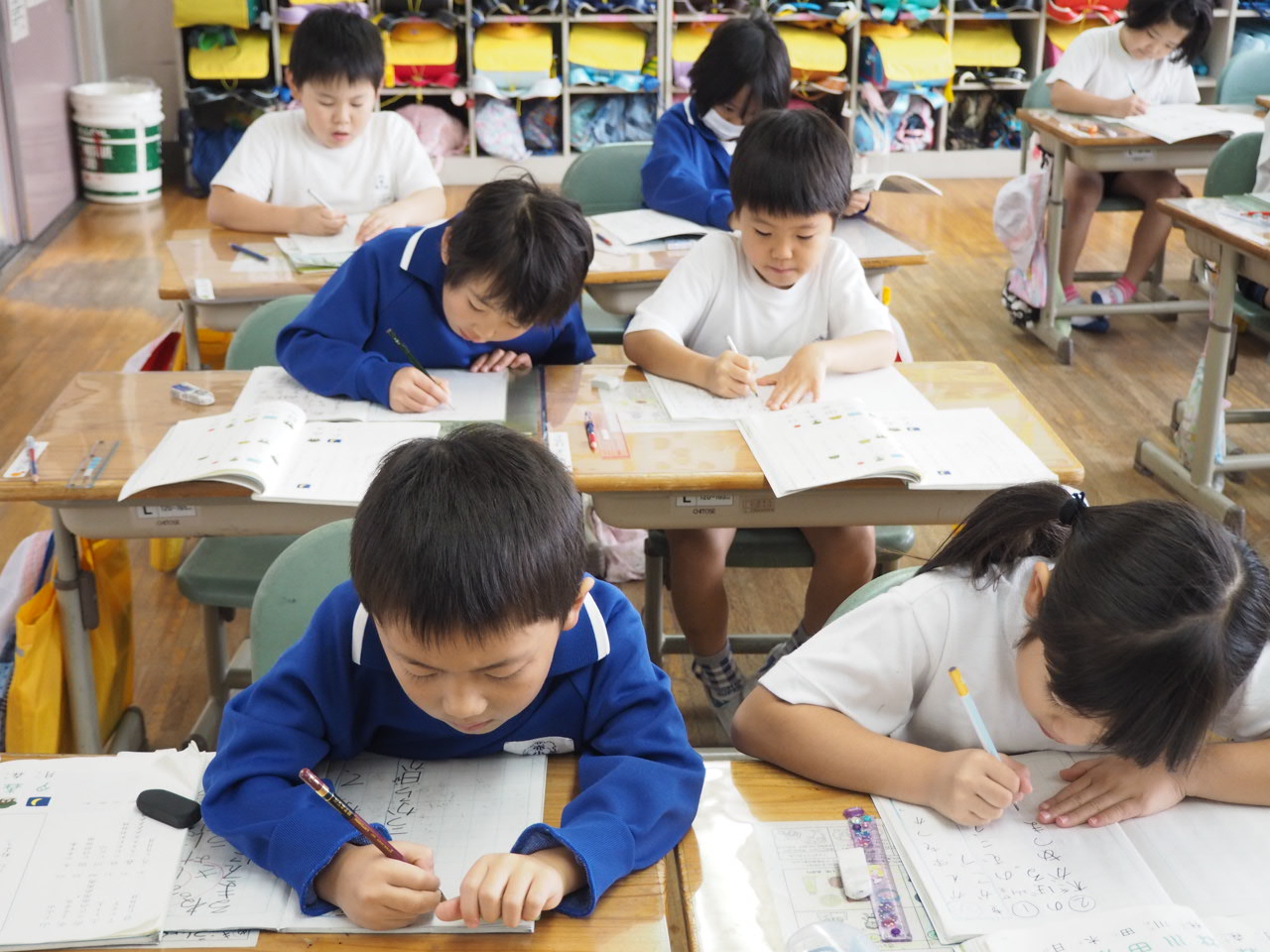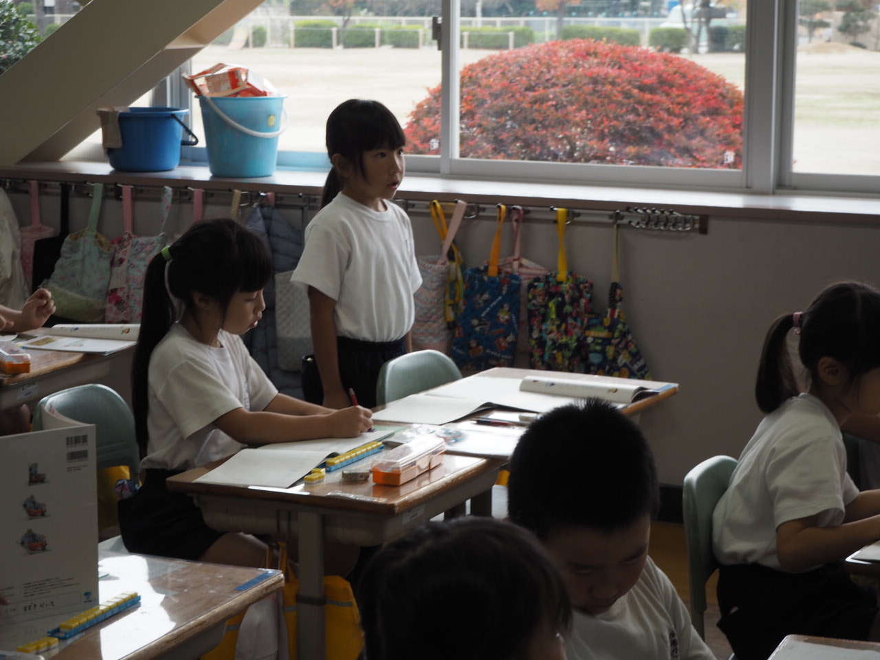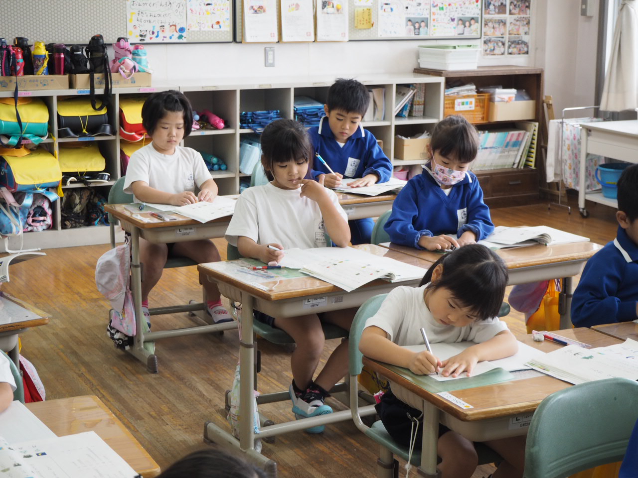 1年、国語「かん字の はなし」。教科書の絵を言葉(漢字)に直しながら,声に出して読んでいます。