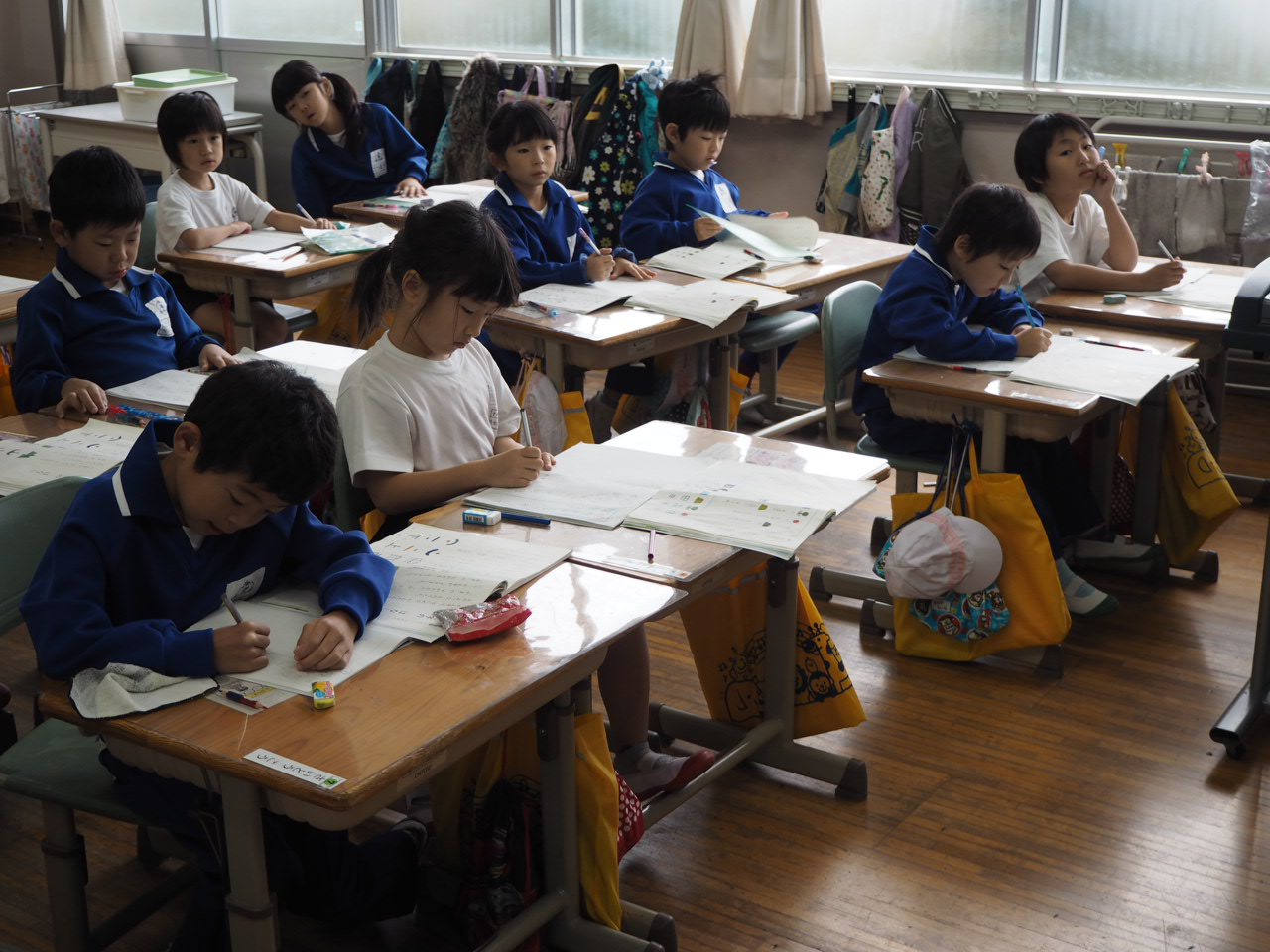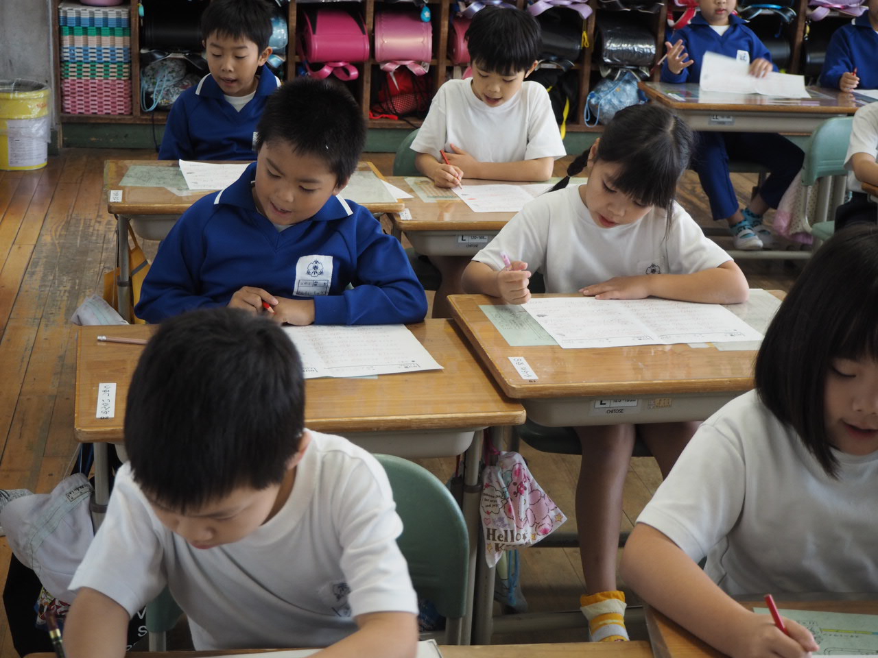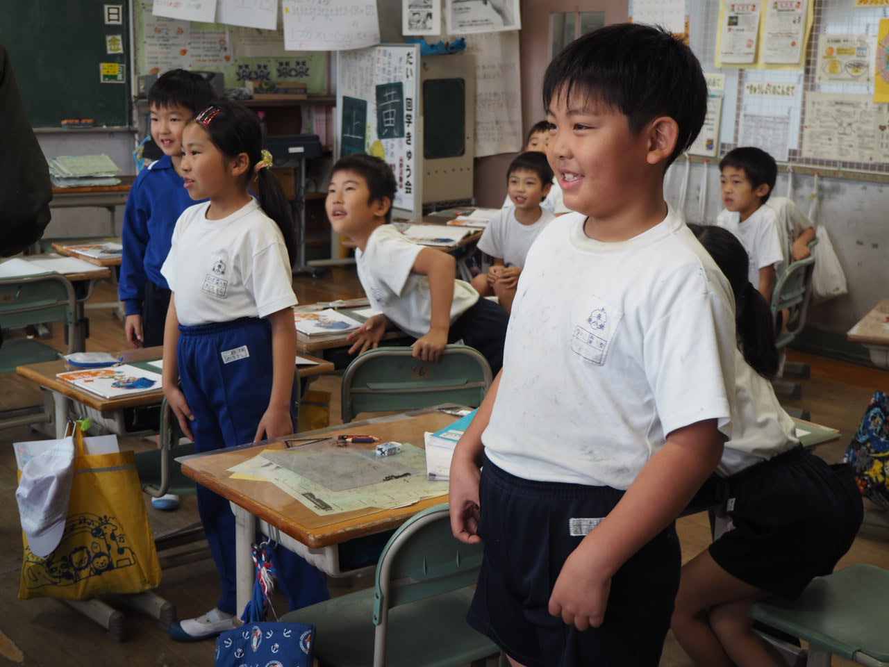 1年、国語「かん字の はなし」。教科書の絵を言葉(漢字)に直しながら,声に出して読んでいます。