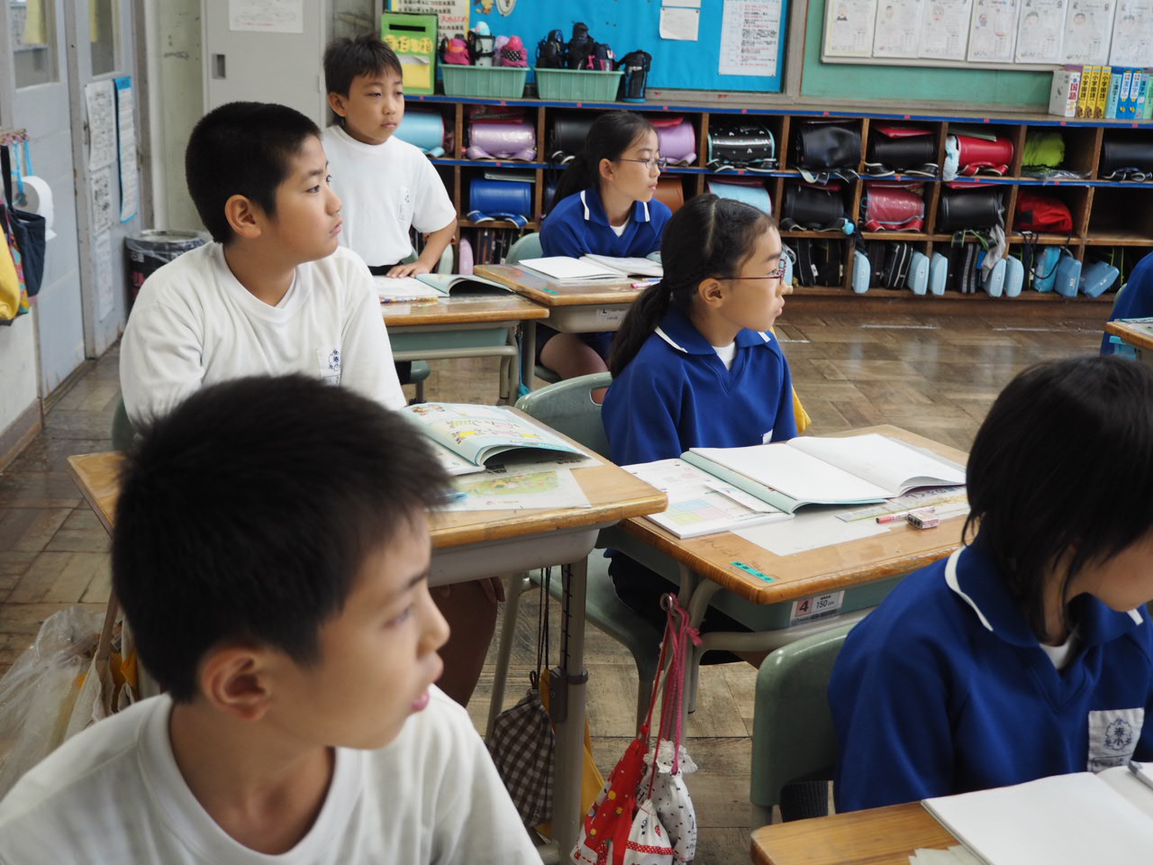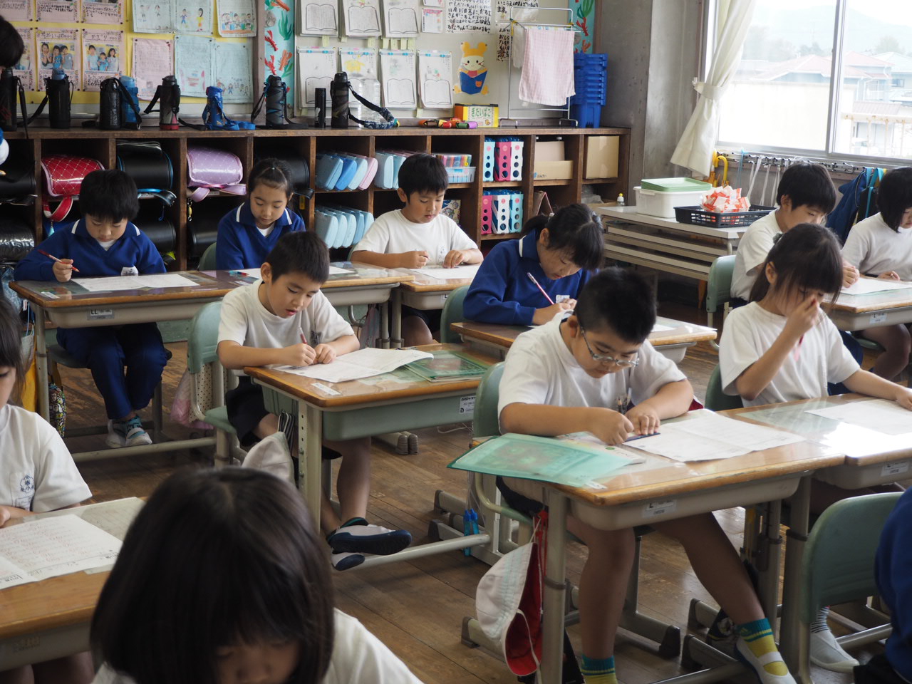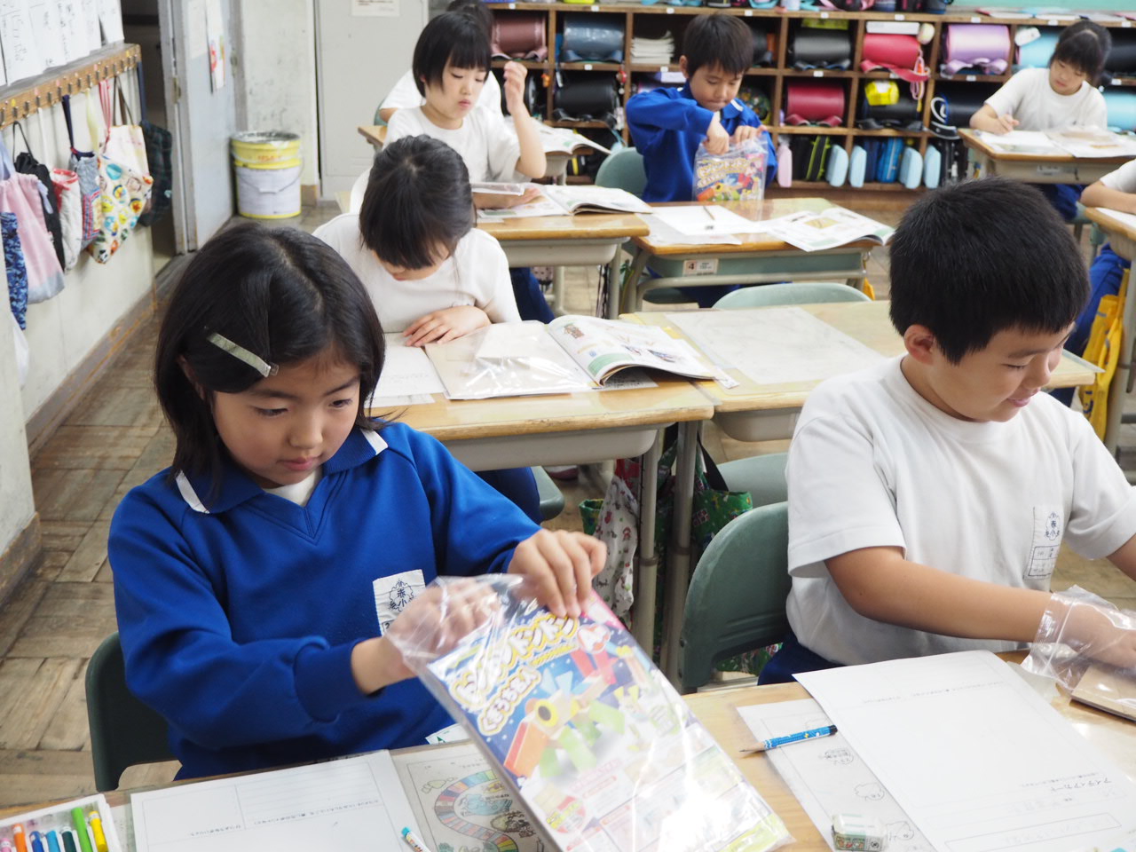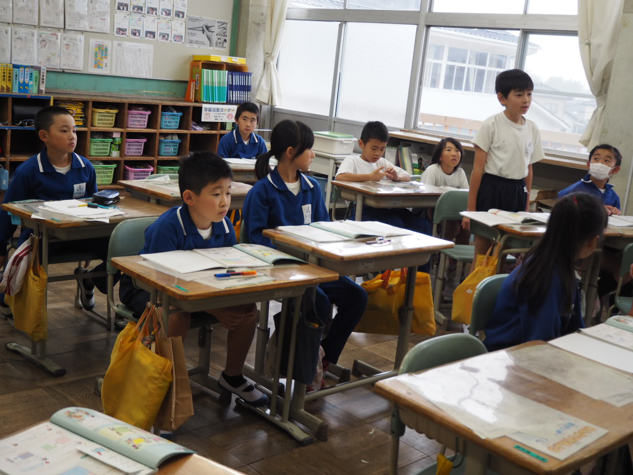 1年、国語「かん字の はなし」。教科書の絵を言葉(漢字)に直しながら,声に出して読んでいます。