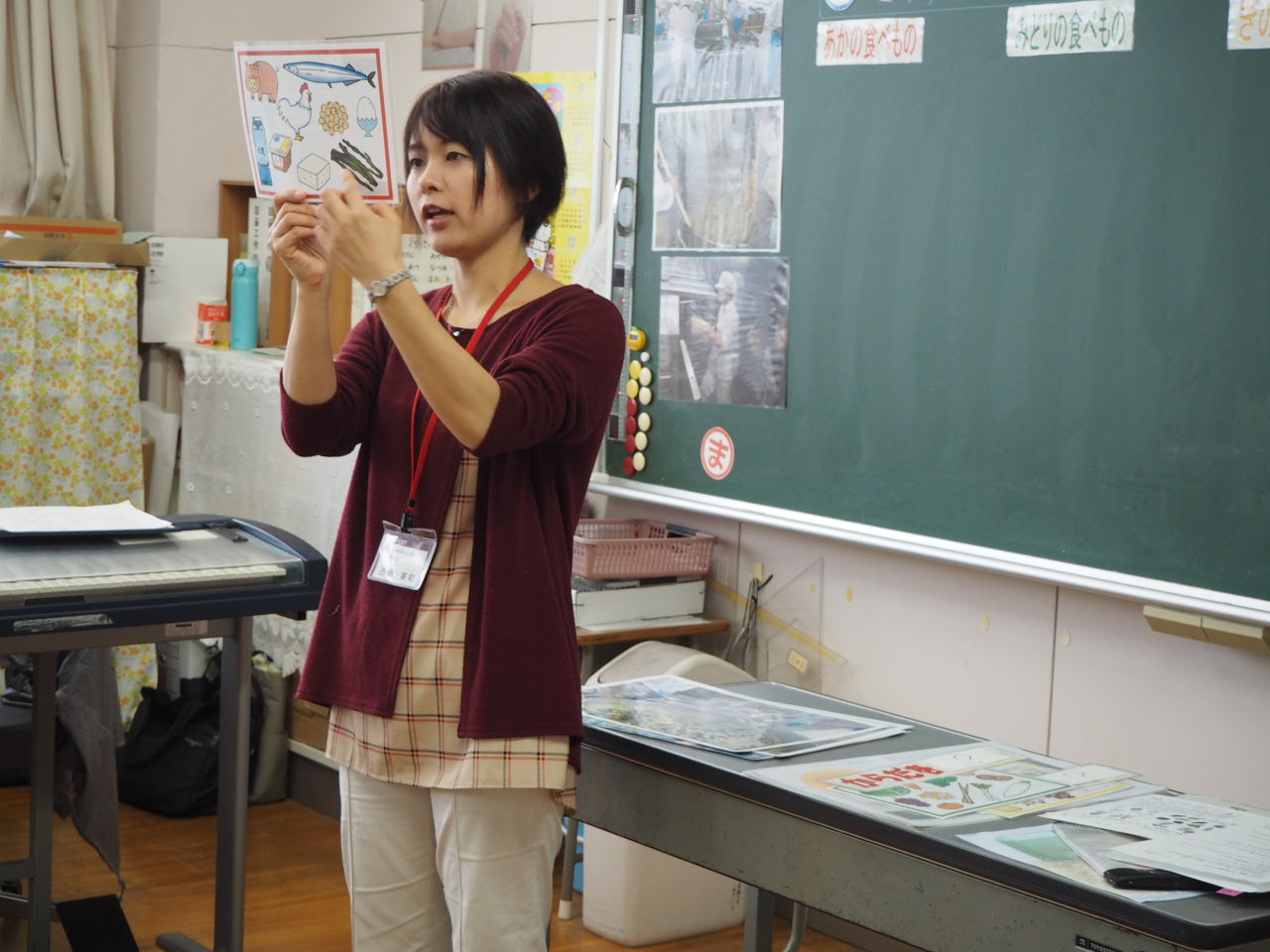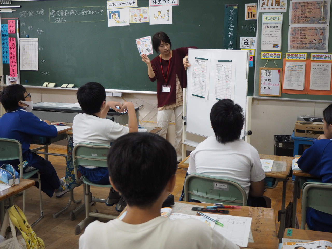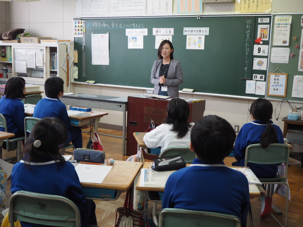 2018年11月9日 11時49分1年、食育指導。栄養士さんに来校して頂き1,2組毎に食育指導をして頂きました。5年生の子どもたちにも行って頂く予定です。