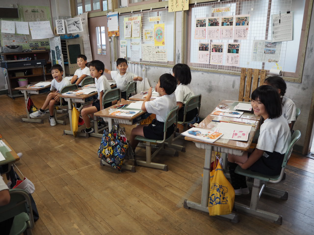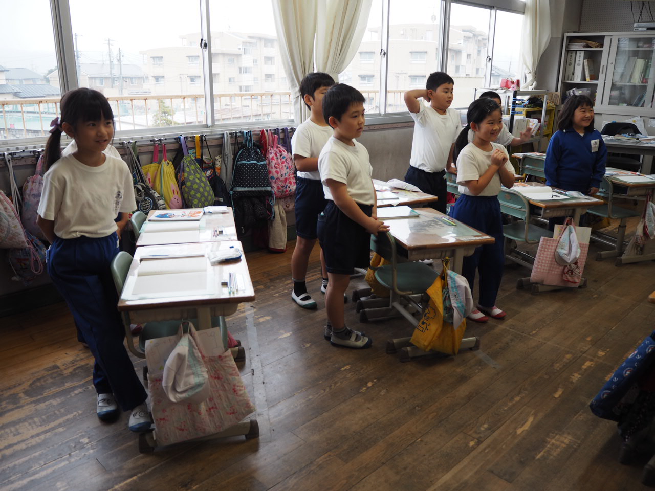 2年生、算数「かけ算」。復習問題として全員で九九が唱えることができるか学習していました。