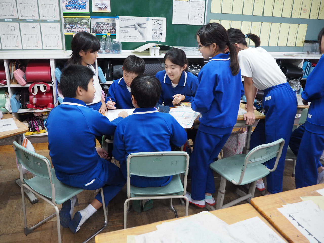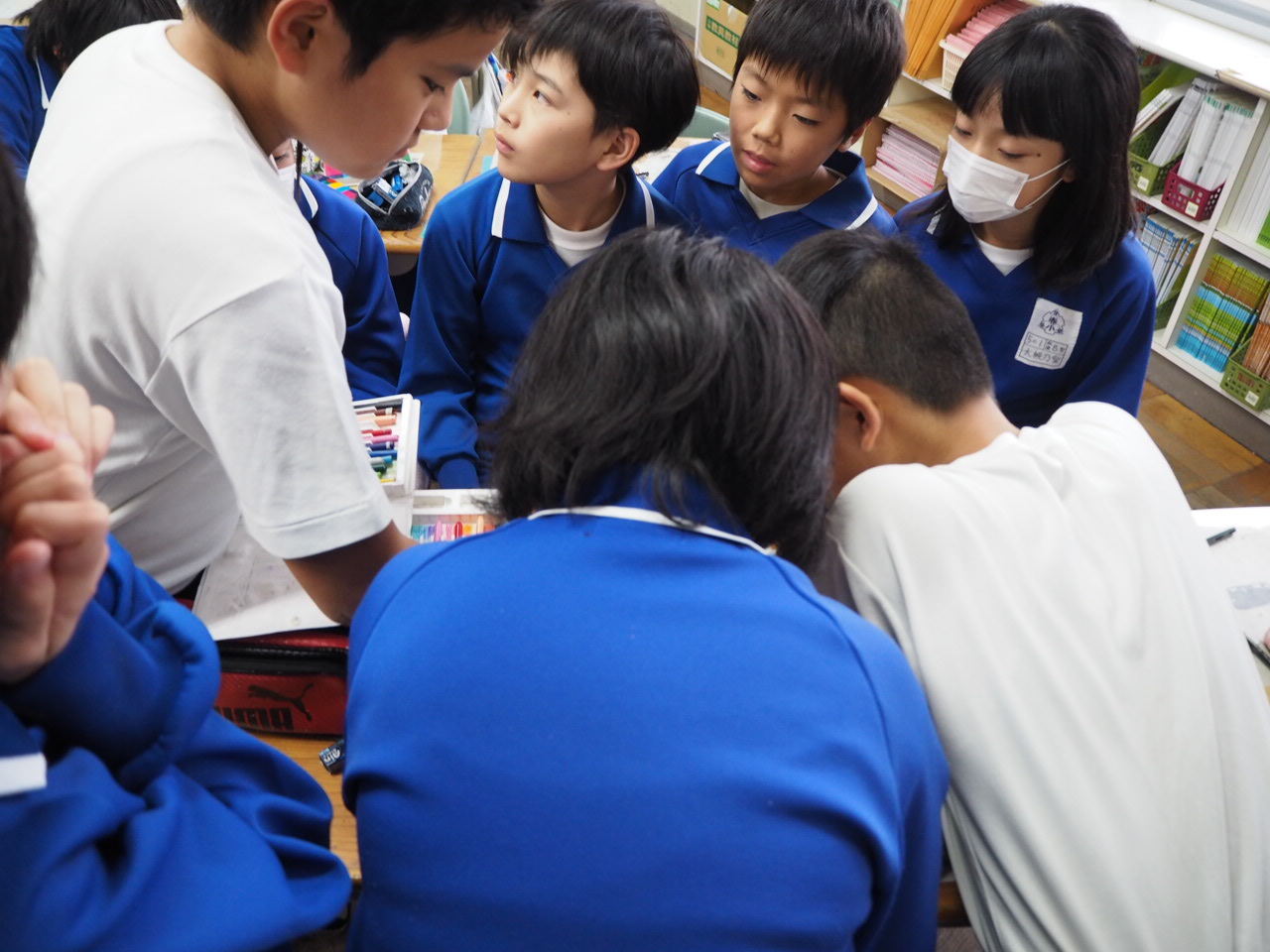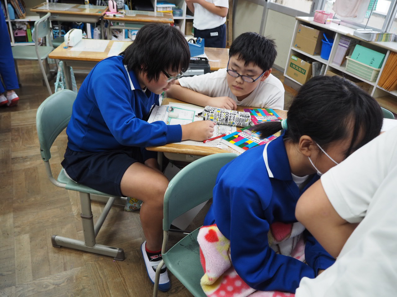 6年、学級活動「係活動について」。自分たちで決めた係活動の役割分担を係活動メンバー毎に集まり話し合っていました。