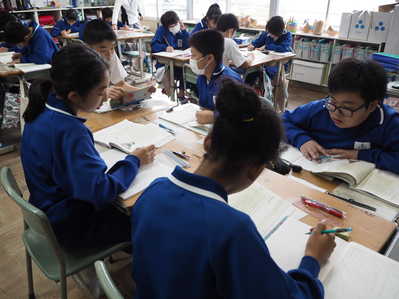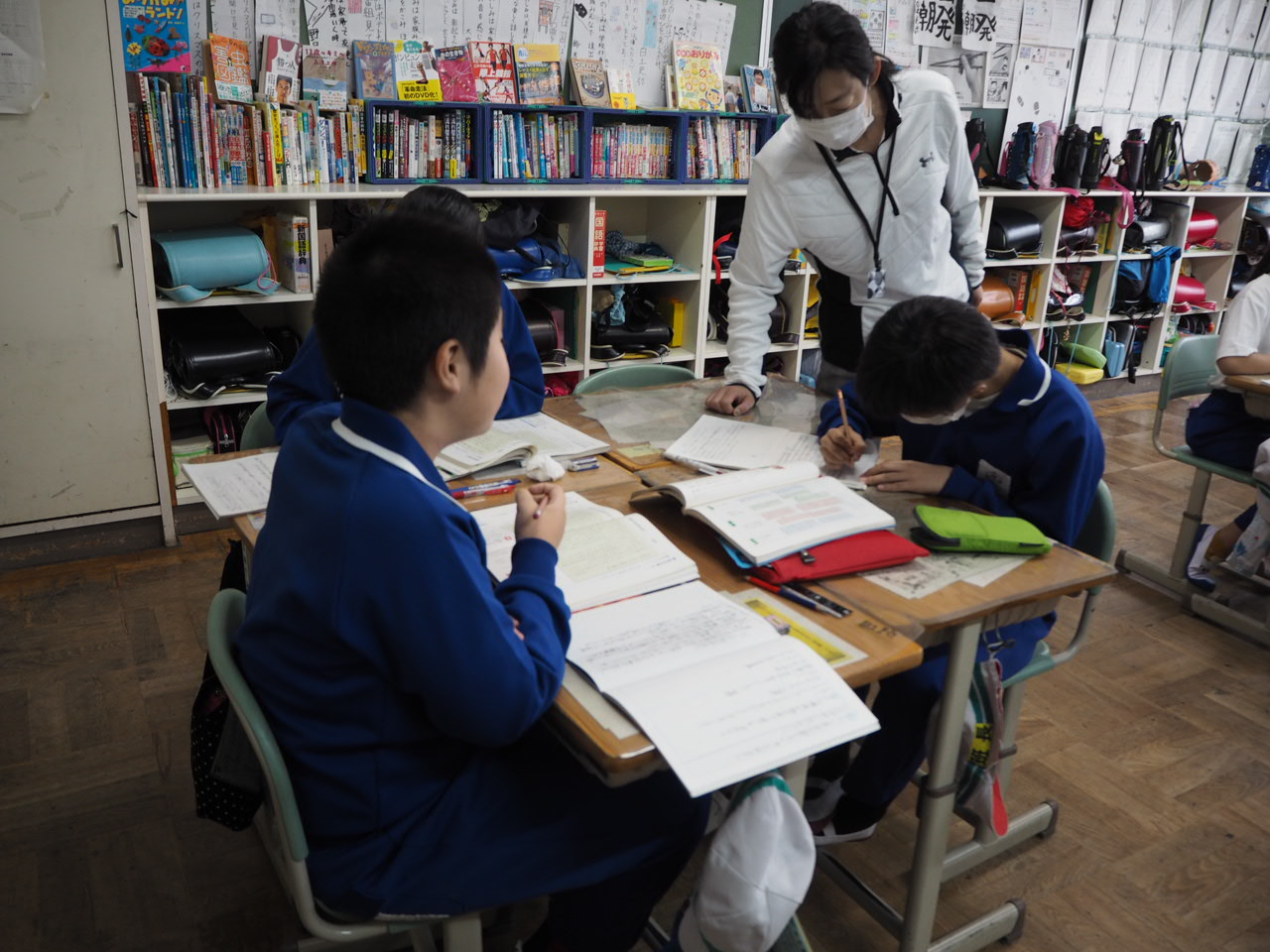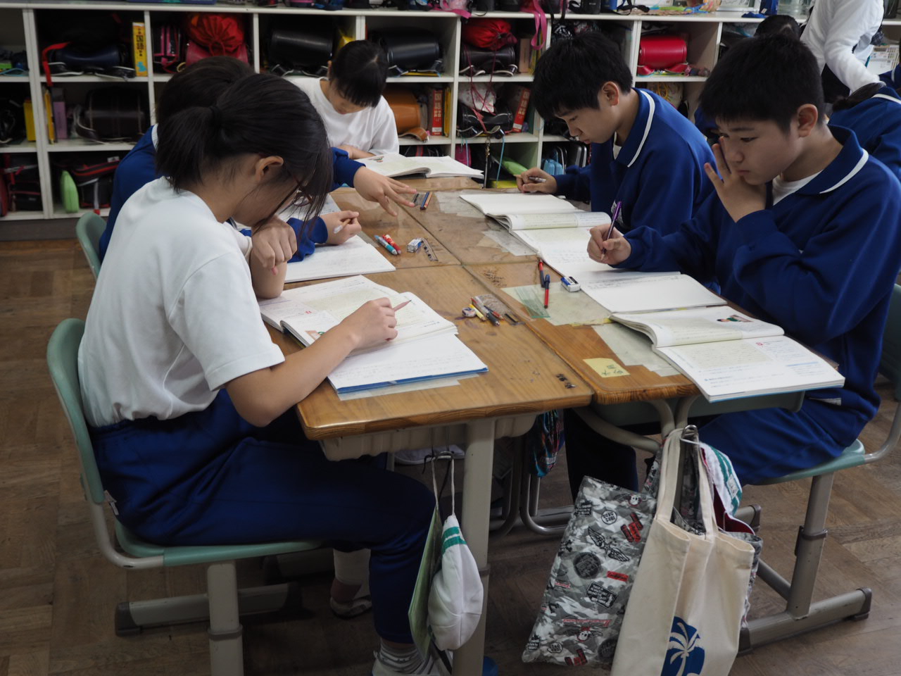 6年、学級活動「係活動について」。自分たちで決めた係活動の役割分担を係活動メンバー毎に集まり話し合っていました。