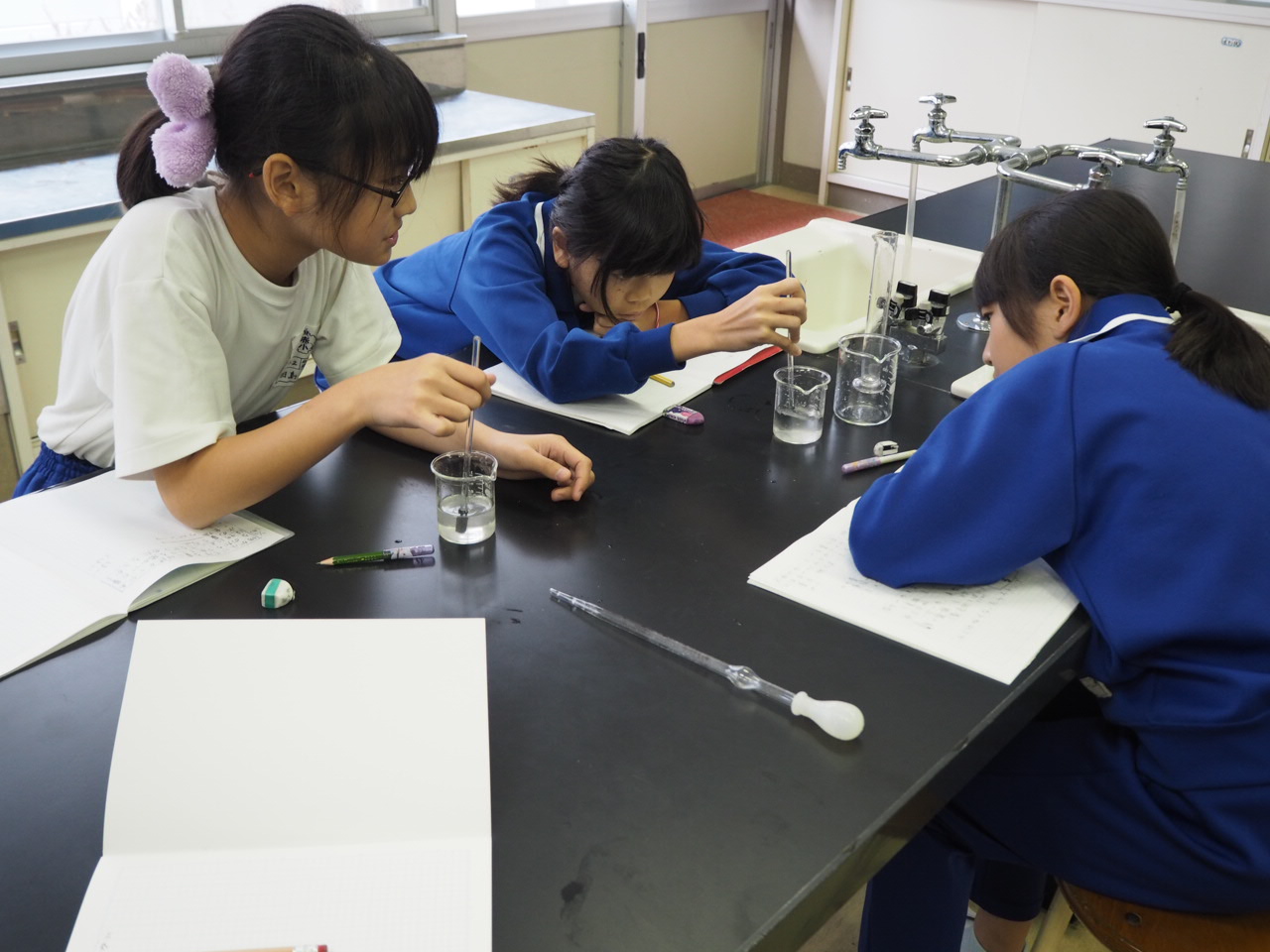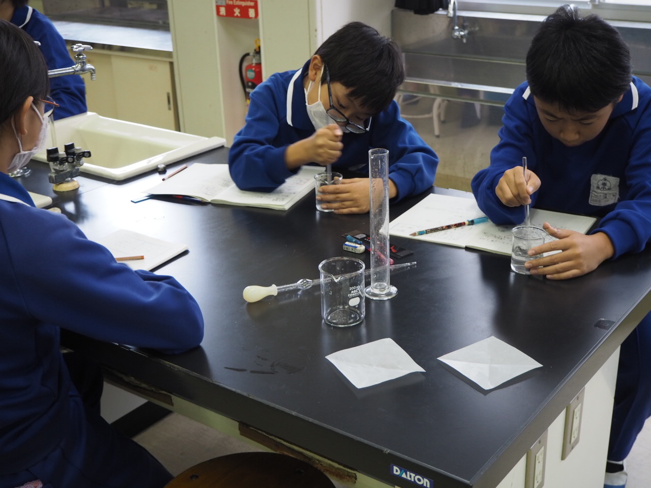 5年、理科「物が水にとける量」。食塩とミョウバンが水に溶ける量には限りがあるかを調べ,まとめています。