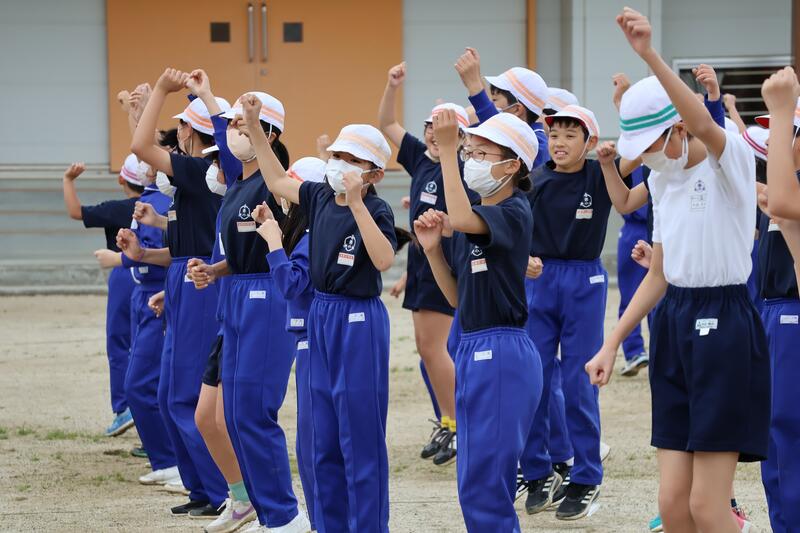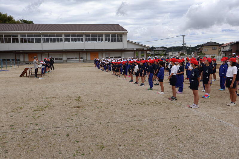 これまで学年や隣接学年ごとに行ってきた練習ですが、今日は全体練習です。校庭にはまだ水たまりが残っていましたが、用務員さんや職員室の先生たちで砂をまき、練習できるようにしてくれました。