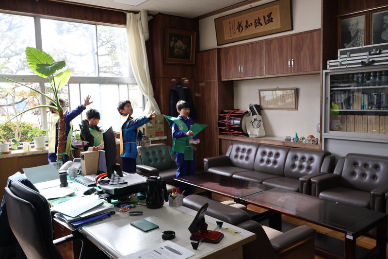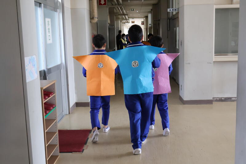 裃(かみしも)をつけた5年生が各教室を訪れ、豆をまいてくれました。「豆」といっても、アレルギー対応のため、ガムテープと紙で作られたものです。当たっても心配ありません。