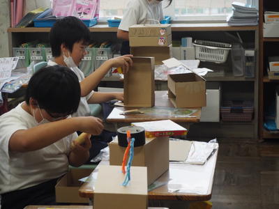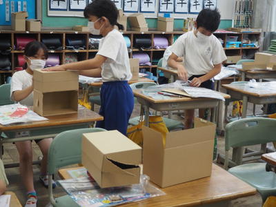 2019年6月21日 14時04分4年、図工「おもしろアイデアボックス」。段ボールの特徴を生かした自分なりのアイデアボックスを考えながら作っています。