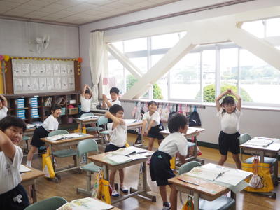 1年、国語「おむすび ころりん」。場面の様子を想像しながら動作を入れながら読み進めています。