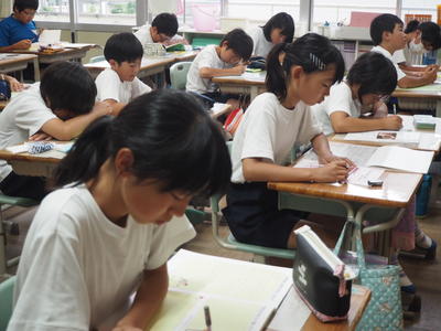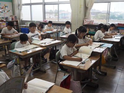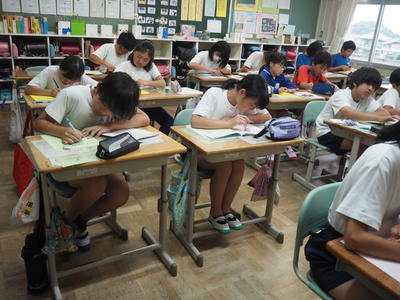 6年、学級活動で昨日の陸上大会までで応援してもらった、先生方や下級生に手紙を書いています。