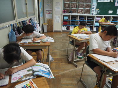 5年、社会「あたたかい土地のくらし」。まとめとしてプリントで学習内容の復習を行っています。