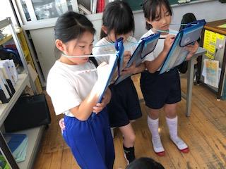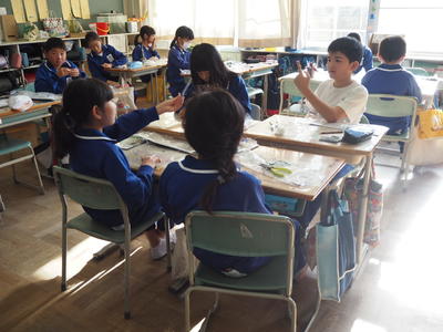 2年生、生活科「うごく うごく わたしのおもちゃ」。おもちゃ祭りの予行をすることで、作った人も遊ぶ人も楽しめる遊び方やルール、説明が当日上手にできるようにと、メモを取ったり話し合いをしたりしていました。