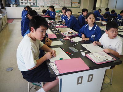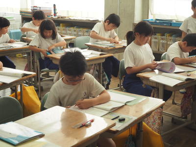 4年、書写「字形の整え方」。長く書く画に気をつけて、姿勢良く、字形を整えて書いています。