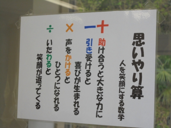 ある教室に「おもいやり算」~人を笑顔にする数学~と題した掲示物があったので紹介します。なんと素敵な言葉でしょう!!その通りですね!!