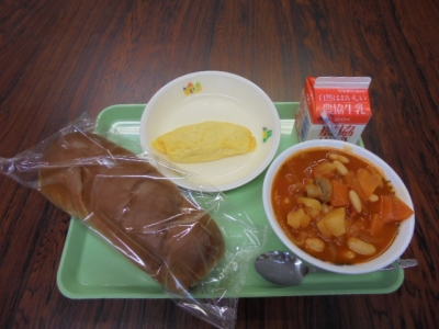 今日は、黒糖パン・ツナマヨ入りオムレツ・鶏肉と豆のトマト煮・牛乳です。熱量は、851kcalです。今日も美味しくいただきました。