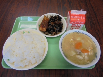 今日は、日本型食事献立で ご飯・赤魚のから揚げ・ひじきの油炒め・呉汁・牛乳です。熱量は、766kcalとヘルシーです。今日も美味しくいただきました。