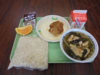 今日は、山菜うどん・鶏肉の甘酢かけ・小魚・オレンジ・牛乳です。熱量は855kcalです。今日も美味しくいただきました。