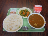 2015年5月29日 11時59分 今日は、麦ごはん・チキンカレー・アスパラガスソテー・ミルメーク(キャラメル)・牛乳です。熱量は837kcalです。今日も美味しくいただきました。