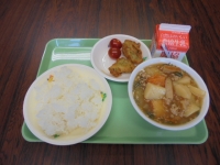 今日は、ごはん・アジフリッター・ジャガイモのそぼろ煮・ミニトマト・牛乳です。熱量は890kcalです。今日も美味しくいただきました。