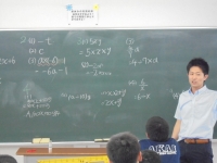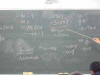 数学の授業は、「文字を使った式」の練習問題を黒板に出て解いていました。参観に行った時は、先生が説明をしている場面でした。集中して取り組む様子がとても素晴らしいです。