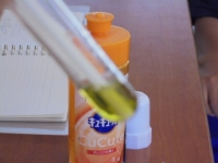 理科の授業は、「植物の光合成と呼吸」について学習しています。参観した時はBTB溶液に呼気を吹き込んだ場合の色の変化(青色→緑色→黄色)を演示していました。