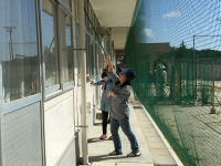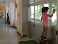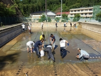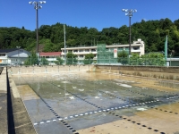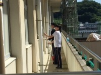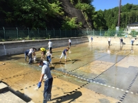 お父さん方にはプールの掃除、お母さん方には校舎内外の窓拭きをしていただきました、