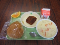 今日は、バーガーパン・白身魚フライ・コーンポタージュ・オレンジ・牛乳です。