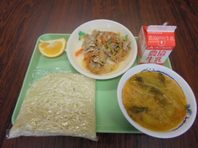 2015年6月25日 12時51分 今日は、担担麺・肉と野菜のバーベキューソテー・甘夏・牛乳です。
