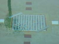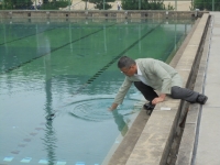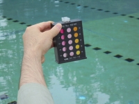 2015年6月26日 09時29分 先日のPTA奉仕作業できれいになったプールに給水が完了し、滅菌器も作動し始めました。定期的に塩素濃度を測定したり、プールやプールサイドの点検をしたりしています。排水溝も金具で固定されて動かないことも給水前に確認済みです。