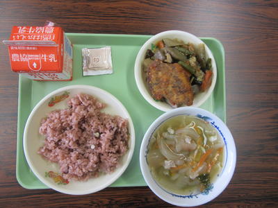 2019年3月11日 17時47分今日の給食の献立は、「赤飯」、「ごま塩」、「牛乳」、「かれいの竜田揚げ」、「車ふのにしめ」、「沢煮わん」で、エネルギーは783kcalです。