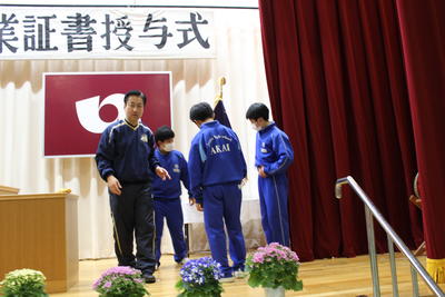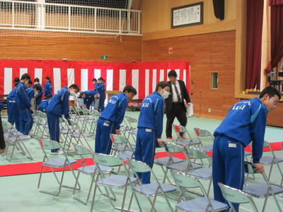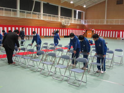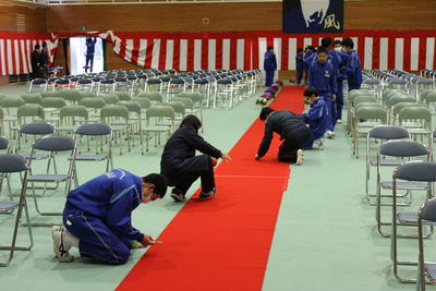 今日の午後は、明日に迫った卒業証書授与式の会場作成を行いました。会場となる体育館の内部は、2年生がシート敷き、いす並べ、花の設置、そして卒業生が通る赤いカーペット敷きなど責任をもって一生懸命に作成してくれました。