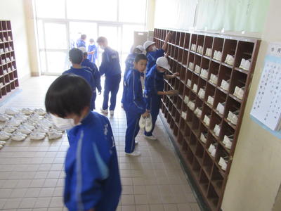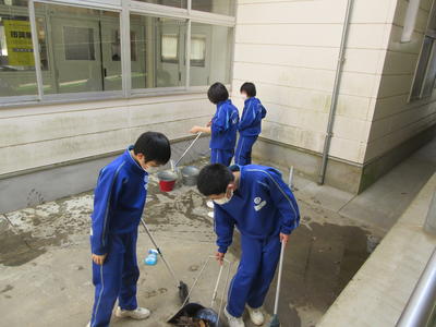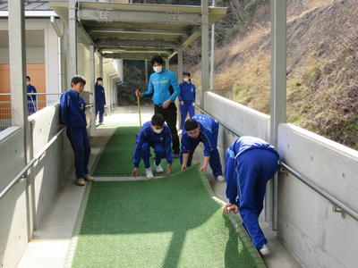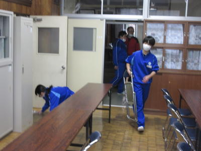 校舎、体育館周辺の清掃は、1年生が行いました。来賓控室の校長室の準備、昇降口、体育館通路など隅々まできれいにしてくれました。