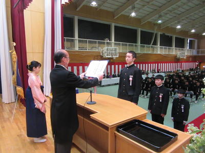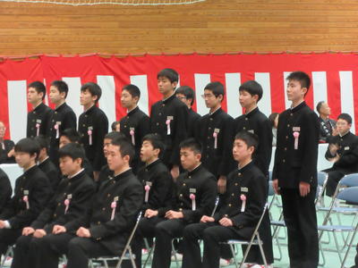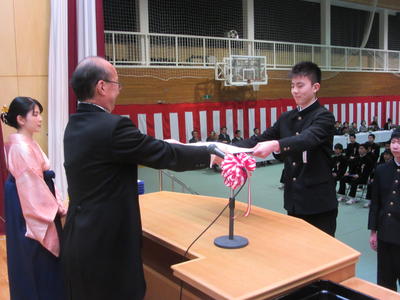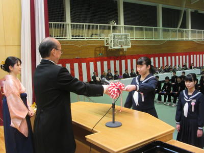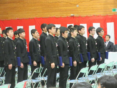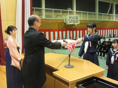 60名の卒業生一人一人に卒業証書が渡され、3年間の中学校生活の思い出を振り返るとともに、新しい高校生活に対する決意を新たにしました。