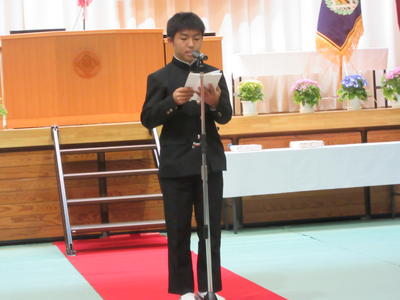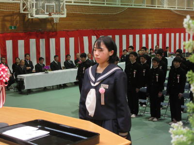 式の後半では、在校生を代表して、2年生の小林あ暖くんから先輩に対する感謝を込めた心暖まる「送辞」が送られ、卒業生代表からは、根本あ謡さんから「答辞」が述べられました。3年間の中学校生活の思いと先生方や友達、そして家族への感謝の気持ちが込められた答辞で思わず涙がこみあげた卒業生や保護者の方、先生もいました。