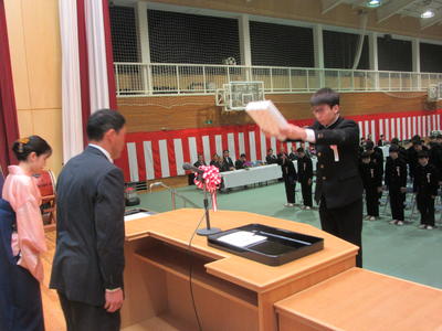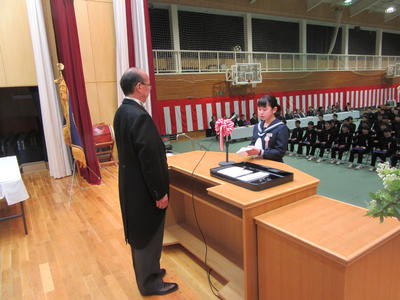 ご来賓の方より祝辞と励ましの言葉をいただいた後は、卒業記念品として、学校から「卒業証書ホルダー」を卒業生代表の我妻あ聖希さんへ、PTAから「印鑑」を木村あ陽人くんへ贈られました。
