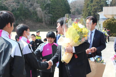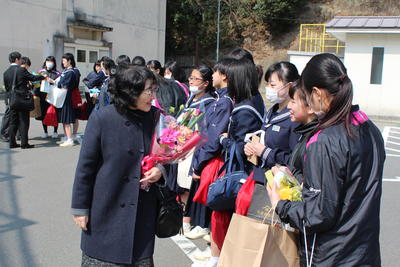 離任式の後、見送りが行われました。たくさんの卒業生も参加し、転出される先生との別れを惜しんでいました。生徒の皆さん、保護者の皆様ありがとうございました。転出される先生方のご健康と新任地でのご活躍をお祈りいたします。