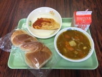 今日は、ねじりパン・オムレツ・大豆のカレースープ・牛乳です。