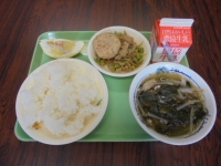 2015年7月8日 12時32分今日は、枝豆ごはん・炒り豆腐包み焼き・春雨スープ・ジューシーフルーツ・牛乳です。熱量は815kcalです。今日も美味しくいただきました。