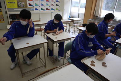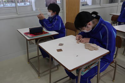 2年1組は、「美術」で手鏡を制作していました。形はそれぞれですが、絵を描いて色を塗る生徒、木目を生かす生徒と自分なりの考えで完成させていました。