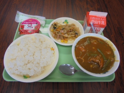 今日は、麦ごはん・夏野菜カレー・ナムル風煮びたし・アセロラゼリー・牛乳です。