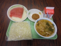 2015年7月16日 14時13分 1学期最後の給食は、味噌ラーメン・かぼちゃチーズフライ・スイカ・牛乳です。熱量は813kcalです。今日も美味しくいただきました。