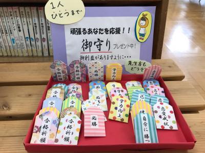 そして今年も図書室から受験生の皆さんを応援しようと合格祈願お守りを作り入り口近くに置いたところ、嬉しそうに持って行く生徒の姿が何人か見られました。
