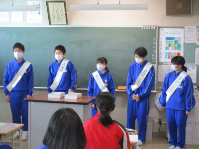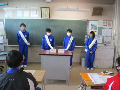 明日、行われる立会演説会に向けて立候補者が各教室を訪問して、あいさつを行いました。立候補者の教室の入退場、教室内で聞く態度が大変立派でした。