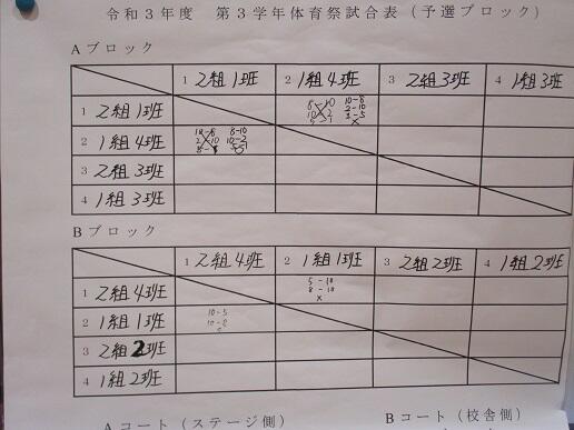 各クラス4班編制とし、2班ずつA・Bブロックに分けて総当たりの試合を行いました。最終的に順位決定戦まで行う予定でしたが、時間が足りず途中で終了となってしまいました。(残念・・・)