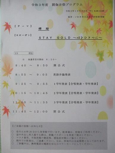 いわき市内の新型コロナウィルス感染者の減少や感染レベルの引き下げを受け、今年度も令和3年度「閼伽井祭」を保護者の皆様をお招きしたうえで無事開催する事ができました。