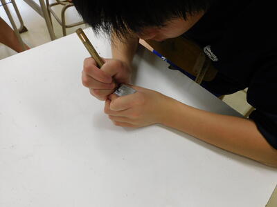 2024年5月9日 12時03分3年生の美術では「篆刻」を行ってます。自分の名前の印鑑を丁寧に彫っています。力加減が難しく、あまり力を入れるとすぐに失敗してしまうので慎重に彫りを進める必要があります。普段の授業に増して、生徒たちの集中力が高まっている授業です。
