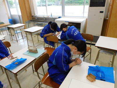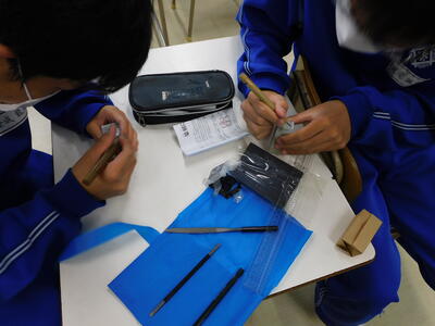 3年生の美術では「篆刻」を行ってます。自分の名前の印鑑を丁寧に彫っています。力加減が難しく、あまり力を入れるとすぐに失敗してしまうので慎重に彫りを進める必要があります。普段の授業に増して、生徒たちの集中力が高まっている授業です。
