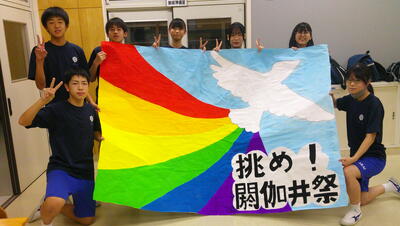 10月18日(金)に行われた閼伽井祭では、スローガン係が制作した作品が披露されました。先日は、あえて制作途中までの公開となりましたが、このような作品になったということを、メンバーとともに公開いたします。閼伽井祭を盛り上げることの一助になりました。みなさんありがとうございました。